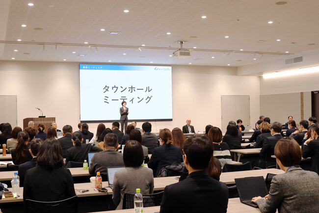 社員ミーティングでは代表取締役社長の武内紀子が全社員に向けて経営方針を説明し、その後、社員からの質問を受け付けて経営陣と社員が対話するタウンホールミーティングを実施しました。経営方針への質問やこのような取り組みをしていきたいといった声があり、活発な意見交換の場となりました。