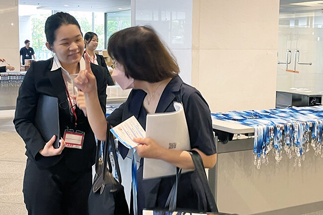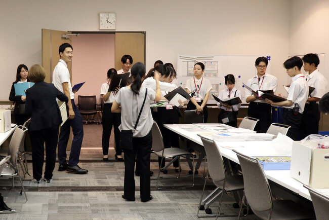 会場を巡りながら、会場のセッティングやレイアウトの工夫などを自分の目で確かめ、会議運営ディレクターがどのような準備をして本番を迎えているのか、どのように会場全体の進行管理や状況把握を行っているのかなど、体験として学んでもらいました。