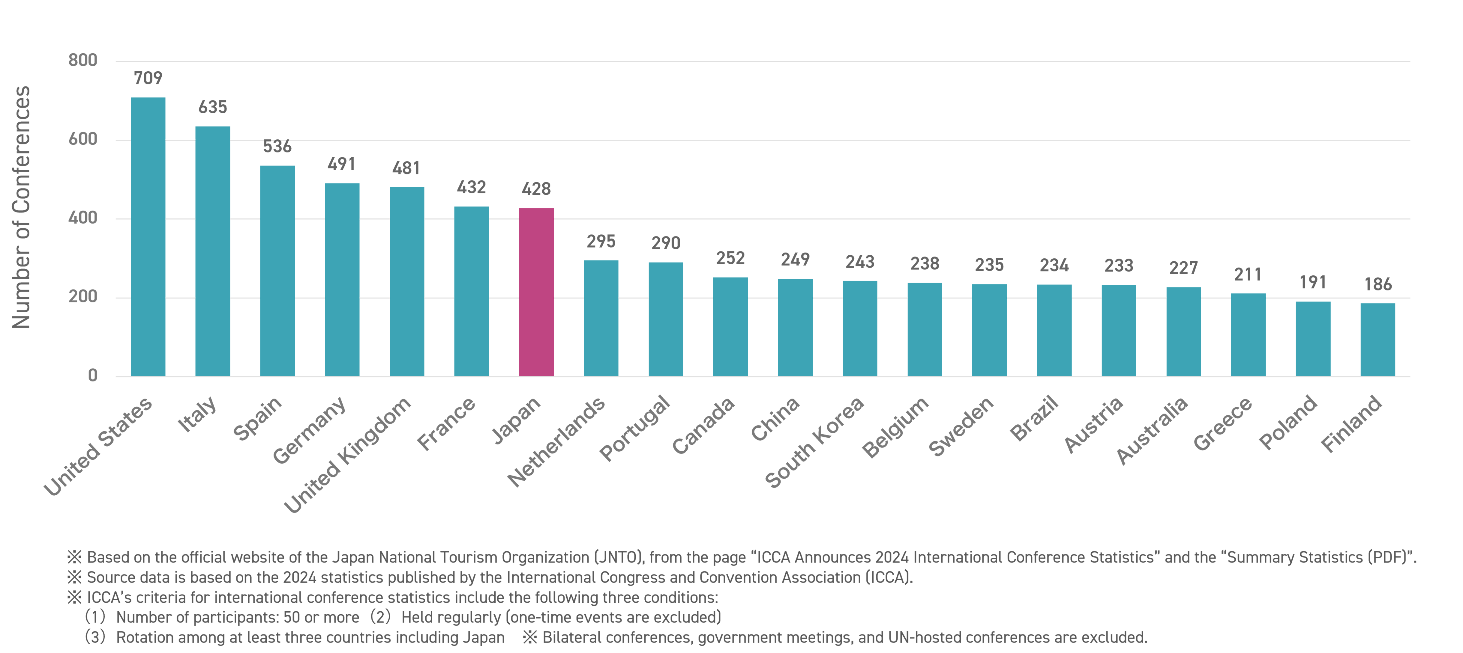 The Japan National Tourism Organization (JNTO) conducts surveys using its own statistical criteria, with the cooperation of local governments, convention bureaus, and national ministries and agencies across Japan. Each year, JNTO publishes statistics on the number of international conferences held nationwide, as well as the number of international participants visiting Japan to attend these conferences.