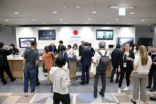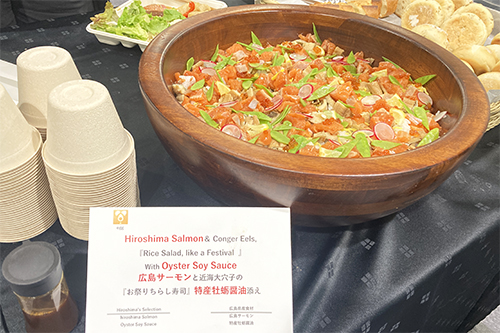 In the IMC dining spaces, menus were planned so that members of the media from around the globe would have fun tasting the ingredients distinctive to the Hiroshima area along with Japanese culinary traditions, plus be aligned with sustainable meetings & events/MICE values. The "Presentation Corner" offered bite-sized portions of Japanese dishes such as Wagyu beef, sushi, ramen, Japanese sweets, Hiroshima oysters, lemons, Japanese sake, and local beer, with menus changing by the day and time to provide diverse dining experiences. The cups and plates were produced from recycled materials.