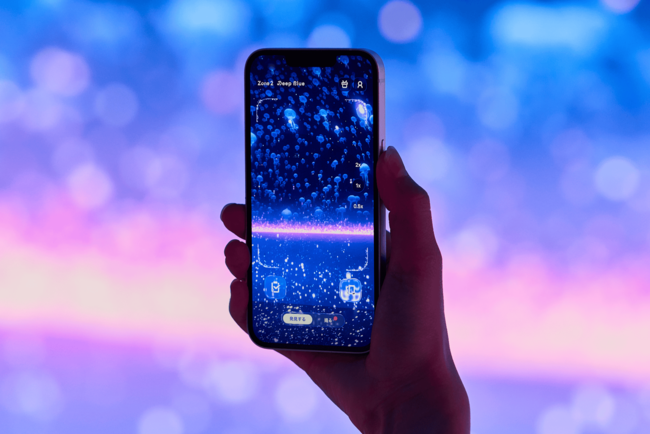 館内は、テーマの異なる6つのゾーンで構成されています。例えば、ゾーン2「ダイブ・トゥ・ブルー」では深海が舞台となり、海面上空からダイブし深海のディープ・ブルーへ潜っていくような体験をお楽しみいただけます。また、ゾーン5「大空に舞う」では、空が反射する湖から大空への転換が描かれます。