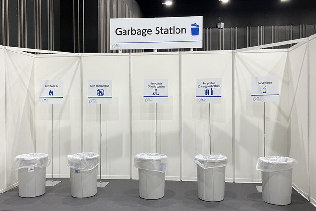 会場内に、国籍を問わず誰もが理解しやすいピクトグラム表示を用いた分別ステーションを設置し、適切な廃棄物管理を徹底しました。