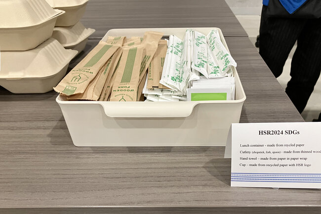会期中の参加者の昼食として、フードロス削減の観点から、お弁当形式をご提案しました。お弁当容器には再生紙製、カトラリー類には再生素材製の製品を採用し、環境負荷の低減にも取り組みました。