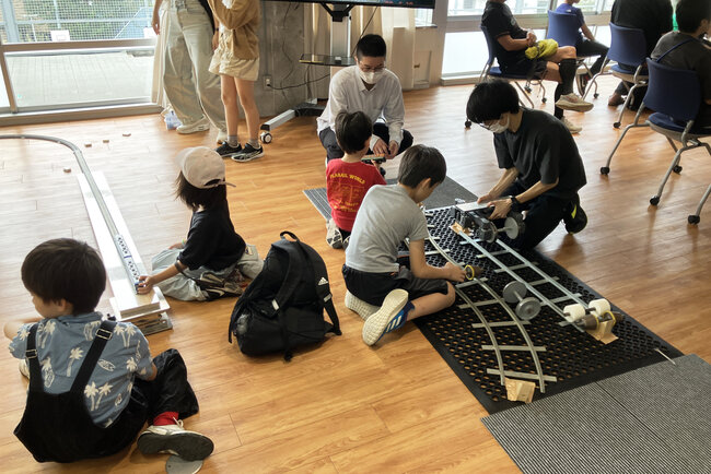 鉄道模型を実際に走らせて電車がなぜ脱線するのかを体感的に学ぶ、明星大学理工学部の宮本研究室による「脱線体験ワークショップ」。鉄道模型の代表的な規格の一つであるHOゲージの模型などを使用し、レールや車両の台車の形状など、言葉だけでは理解しにくい脱線の仕組みについて、宮本先生や同研究室の学生がわかりやすく解説しました。参加した子供たちは熱心に模型を操作しながら、鉄道車両の安全な走行を支える技術についても学ぶ貴重な機会となりました。
