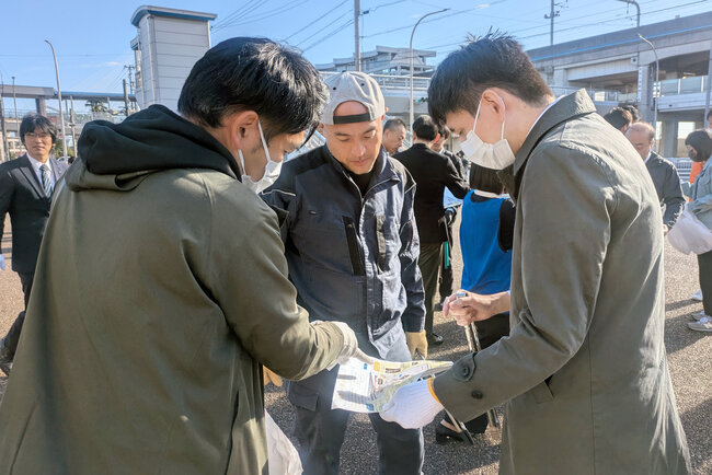 今回は「参加企業・団体内のチームビルディング」と「金城ふ頭をもっと知る」という2つの目的を掲げ、チーム対抗のゲーム形式でゴミ拾いを実施しました。ゴミを1袋集めるごとに金城ふ頭にまつわるクイズに1問挑戦できる仕組みで、ゴミを拾えば拾うほど金城ふ頭を知ることができます。