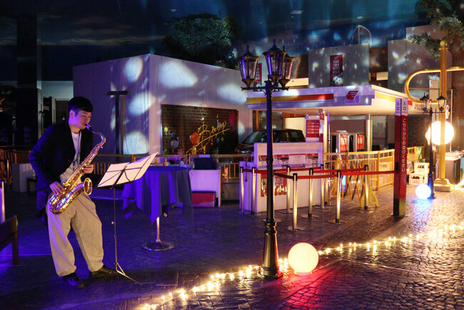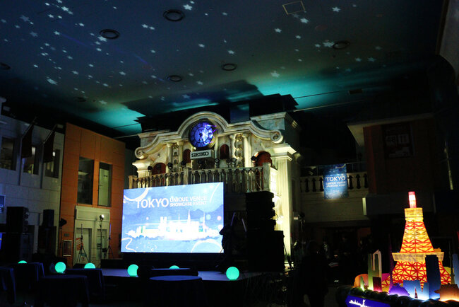 メインステージを設けた中央広場では、天井や時計台を活用した照明演出により、キッザニア東京ならではの街並み空間を印象的に演出し、通常営業時とは異なる非日常的な世界観を創出しました。