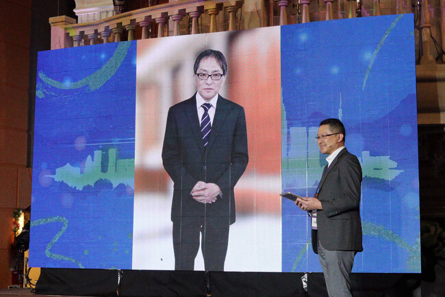主催者挨拶にあわせて、ステージ背後のLEDパネルには、同財団の前田康行常務理事のデジタルヒューマン映像が投影され、藤村氏との掛け合いを展開し、参加者に強い印象を残しました。