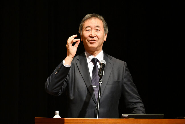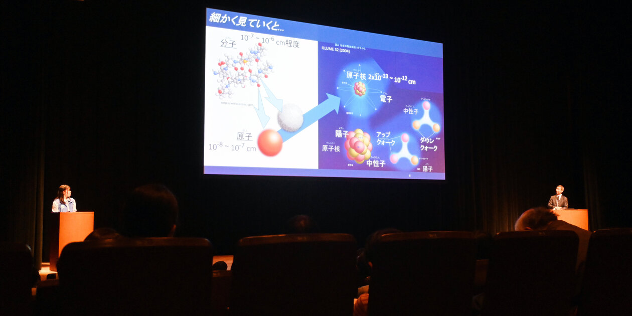講演では、司会者がテーマごとに梶田隆章先生へ質問を投げかけ、掛け合いを交えながら進行しました。